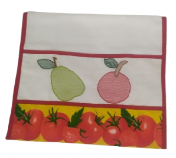 Material atoalhado branco, 100% algodão, inviezado com viez na cor vermelho, barra de tecido vagonite com desenho feito a mão de frutas (pera e maçã), com barra de estampa de tomates na cor vermelho.