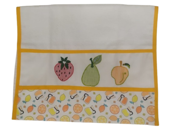 Material atoalhado 100% algodão na cor branco, inviezado com viez na cor amarelo, com cianinha na cor amarelo, barra de vagonite com desenho de frutas, com barra estampada com desenhos de laranja e jarras.